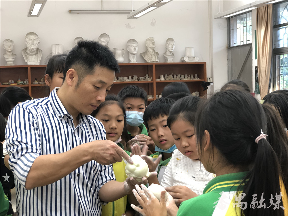 新桥小学苏锐锋老师在进行白色陶泥立体大头佛手工艺制作的教学