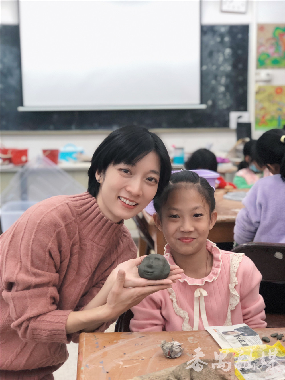 新桥小学曾玉婵老师在进行黑色陶泥立体大头佛手工艺制作的指导