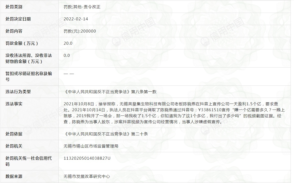 红星资本局注意到,近日,信用中国披露了一则无锡英皇集生物科技有限公司(下称“英皇集科技”)的行政处罚信息。