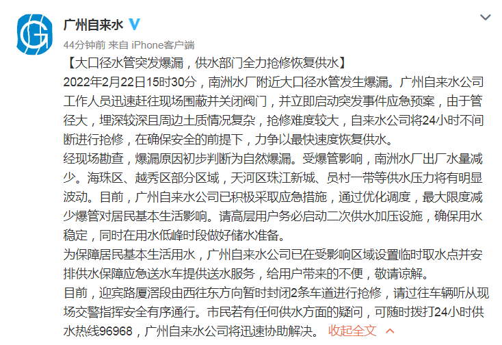 2022年2月22日15时30分,南洲水厂附近大口径水管发生爆漏。广州自来水公司工作人员迅速赶往现场围蔽并关闭阀门,并立即启动突发事件应急预案,由于管径大,埋深较深且周边土质情况复杂,抢修难度较大,自来水公司将24小时不间断进行抢修,在确保安全的前提下,力争以最快速度恢复供水。
