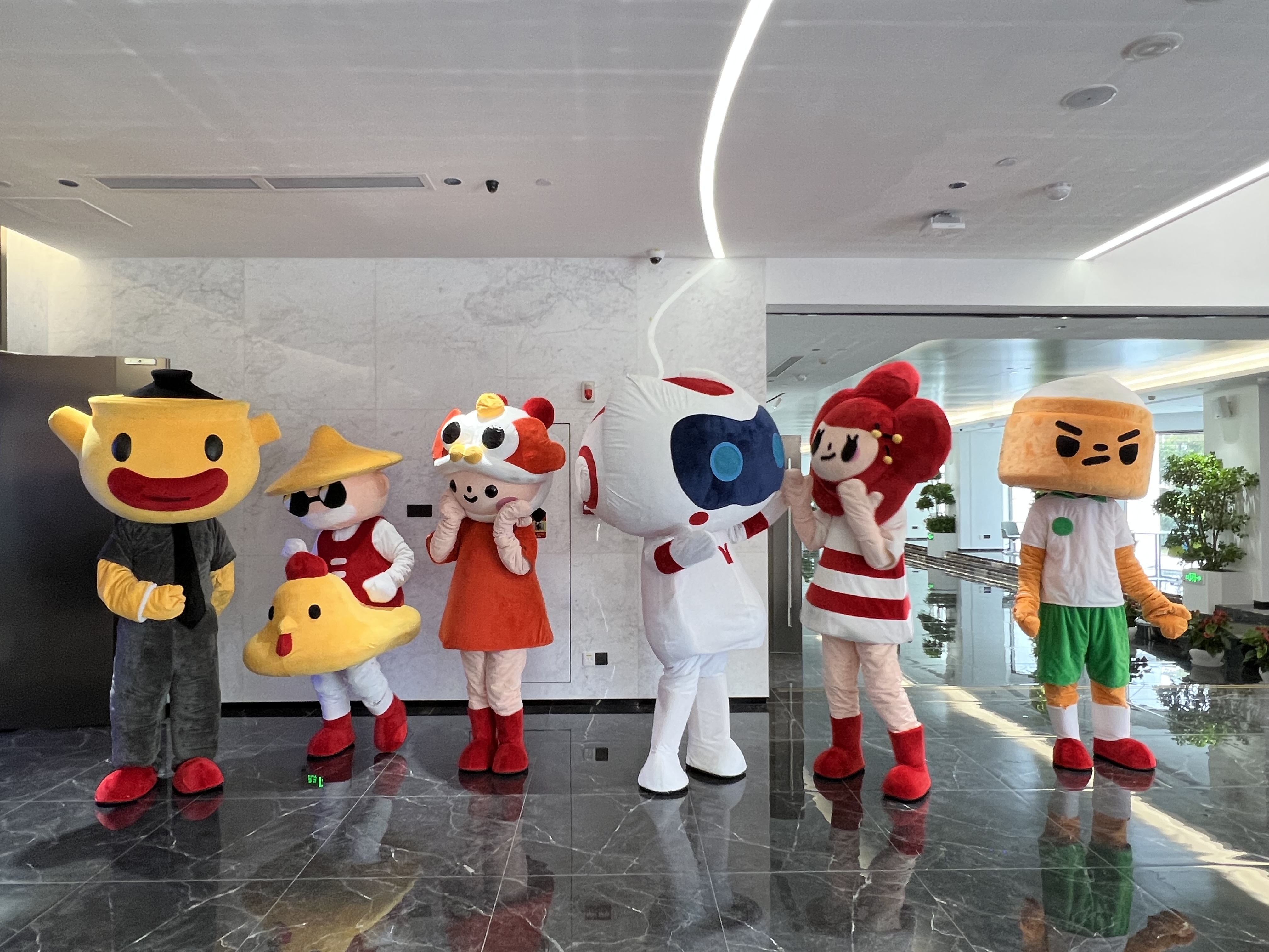 鸡公榄、木棉花、醒狮、凉茶煲、蒸笼……五种极具广府特征的文化元素,被融入塑造为“悠悠街坊”——上班族“茶煲”、高中生“阿笼”、爱美辣妈“阿花”、舞狮队小成员“狮头妹妹”、穿街走巷的“鸡公榄爷爷”。