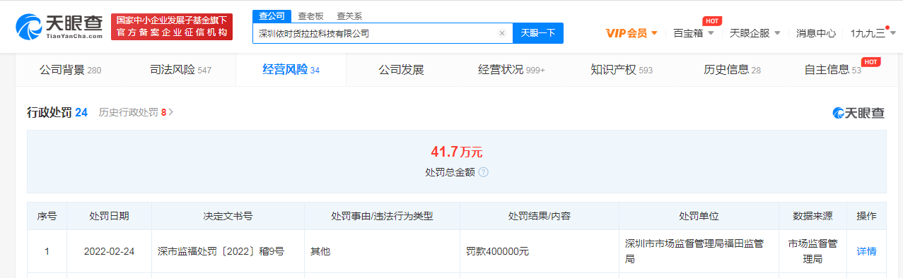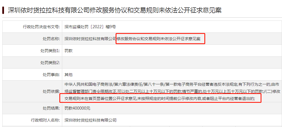 天眼查App显示,2月24日,因修改服务协议和交易规则未依法公开征求意见,深圳依时货拉拉科技有限公司被深圳市市场监督管理局福田监管局罚款40万元。至记者截稿时,货拉拉对此暂无回应。