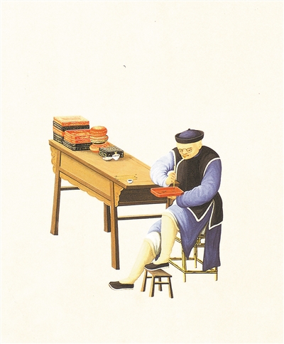 据史料记载,1822年,十三行一带有几千家专营外销商品的店铺。闲话少说,咱们现在就进一家漆器铺逛逛。这个铺子与当时的绝大多数铺子一样,“前店后厂”,货架上摆满琳琅满目的漆器,后面的工场里,工匠正在忙碌着。有的正在“打底子”,用涂粉填补木器表面的缺陷;有的正在“刮灰”;有的正在上漆;有的正在涂过漆的木器上描绘花纹……整个工作场面忙而不乱,生气勃勃。