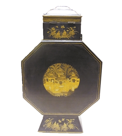 清代黑漆描金人物故事八角带盖扁形茶叶罐(李晓容/FOTOE)
