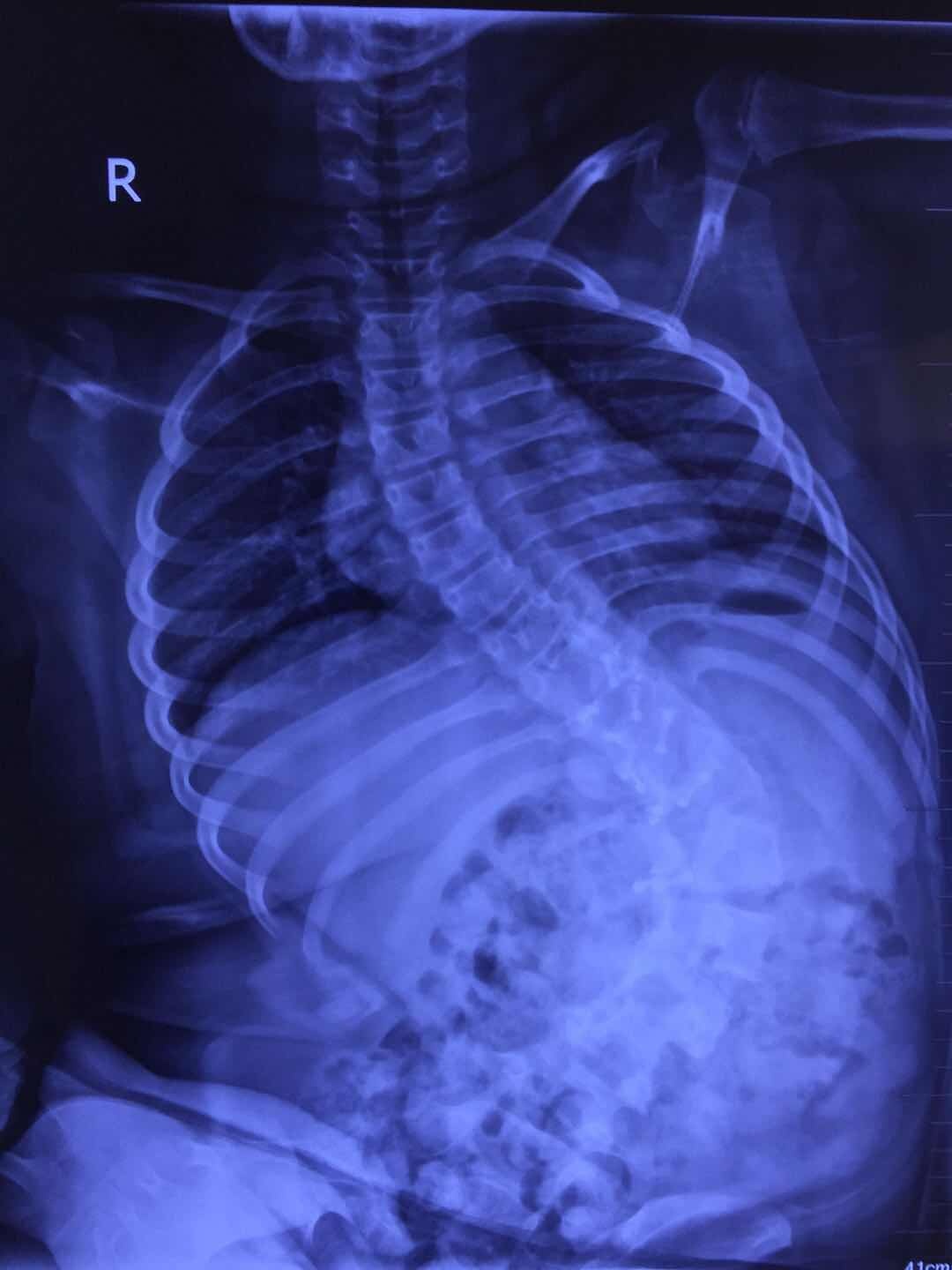 郭晓东提供的影像学资料显示,下腰瘫痪后的孩子脊柱弯成了这样。