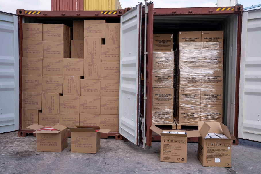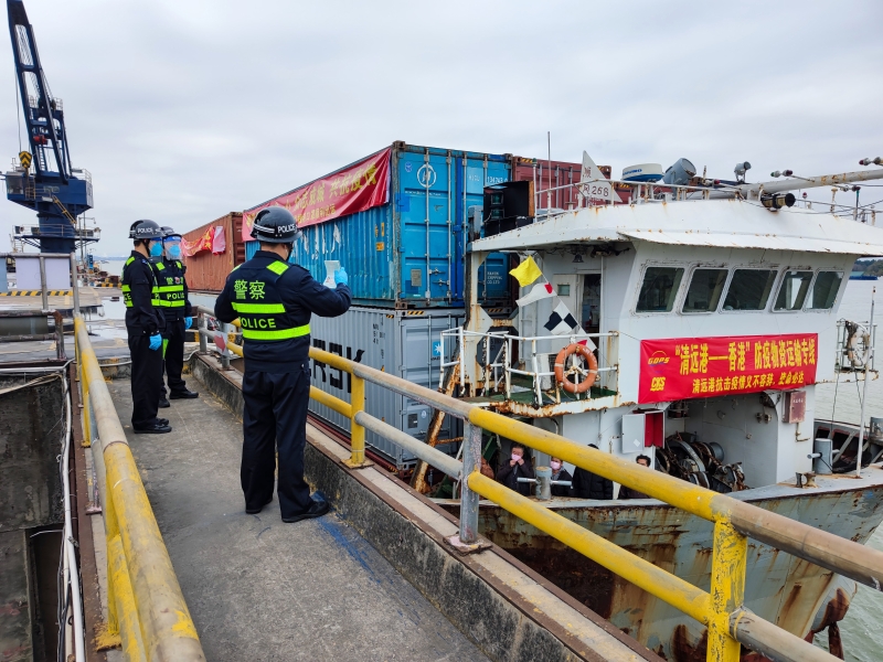 2月24日上午10時,由清遠開往香港、滿載41個集裝箱供港防疫和生活物資的「順風268」停靠肇慶四會港碼頭,肇慶邊檢站開通「綠色通道」,從速辦理出入境邊防檢查手續,確保供港防疫和生活物資快速通關。