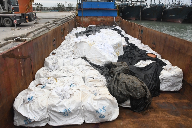 2月12日13时30分,汕头海警局执法艇在辖区海域巡航时,发现1艘可疑散装船正在南澳县码头附近海域进行起锚作业。执法员察觉到该船的锚泊位置可疑,立即前往该船所处区域,表明身份并依法登临,从中查获鸡脚、猪肚、牛筋等冻品230吨。