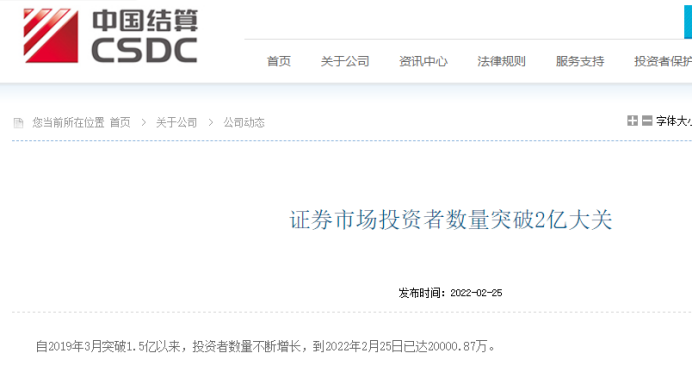 中国结算25日披露的数据显示,自2019年3月突破1.5亿以来,投资者数量不断增长,到2022年2月25日已达20000.87万。这意味着,投资者数量首次突破2亿。
