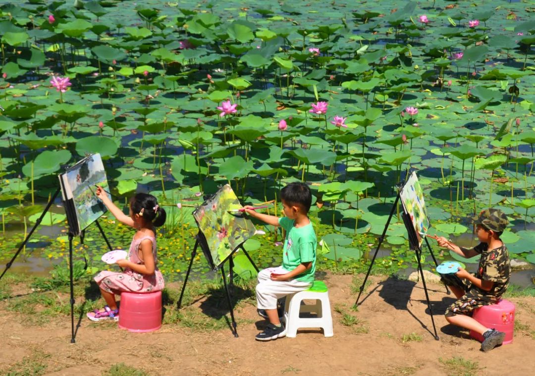 拍于莲溪村。在荷塘边,少年在用笔进行写生,通过画笔,把荷花呈现在画板上。