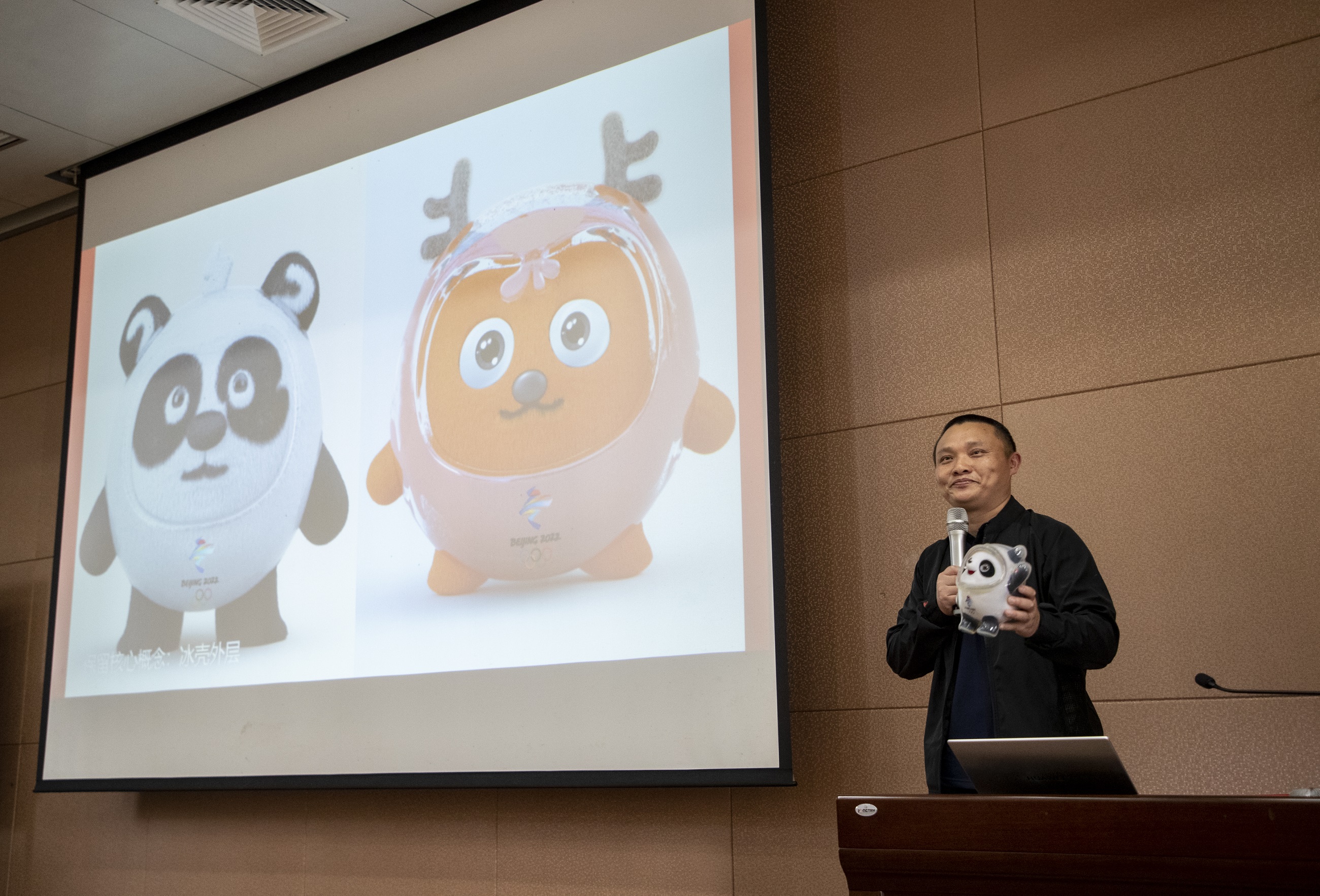 钱磊副教授跟同学们讲述了冰墩墩诞生背后的故事。2018年10月10日,“冬奥会、冬残奥会吉祥物征集”宣讲会在广美举行。作为最后一站,广美接到征集邀请时,距离截稿只剩下21天。第二天,创作团队召开了第一次工作会议,正式开工。10月30日,广美选出了16套投稿作品,送往北京。2019年1月21日,团队接到了奥组委的正式电话,称广美作品入围十强。1月25日,团队在北京与冬奥组委第一次正式碰面。让他们意外的是,十强中有三件是广美的作品。其中的“冰糖葫芦”作品获得下一步修改机会,团队由此踏上了修改作品的漫漫征程。“2019年春节特别难忘。因为修改截稿时间是年初九,我们年初二到年初八都在加班加点地进行修改,没有休息。而且出于保密需要,我们还不能告诉家人,只能说领了‘神秘任务’。“钱磊笑说。经过21次的修改,“冰糖葫芦“一步一步演变成了冰墩墩,最终呈现在世人面前。