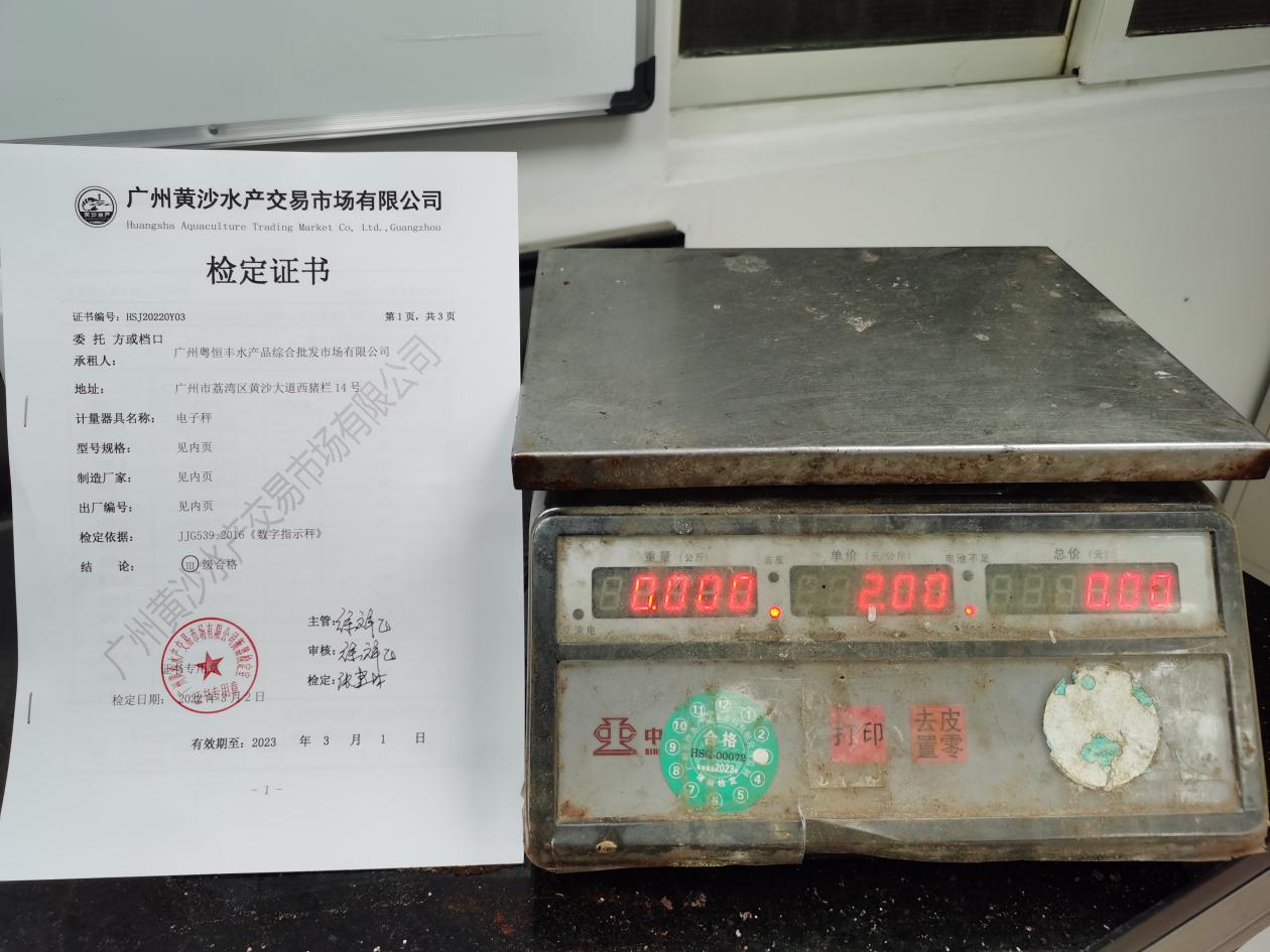 近日,有消费者投诉广州黄沙水产市场“营仔海鲜行存在缺斤少两现象”。荔湾区市场监管局第一时间组织执法力量介入,多宝市场监管所协同所属市场管理方,三级联动,对营仔海鲜行实施突击执法检查,现场锁定店档全部秤具,将涉事档口电子秤查封送检定机构进行检定,检定结果为合格。