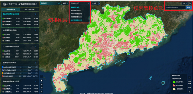 该应用平台具体如何使用呢?登录后可在广东省地图上查看环境管控单元分布,通过切换图层查看水环境、大气环境、自然资源、近岸海域等不同管控分区分布。在地图上点击管控单元或者在地图右上角搜索框搜索管控单元名称,查看相应管控单元所在位置、类型、相关管控要求等基本信息。左侧统计信息栏中可查看环境管控单元数量、面积及其占比等统计信息,点击详情按钮可进一步查看统计详情。