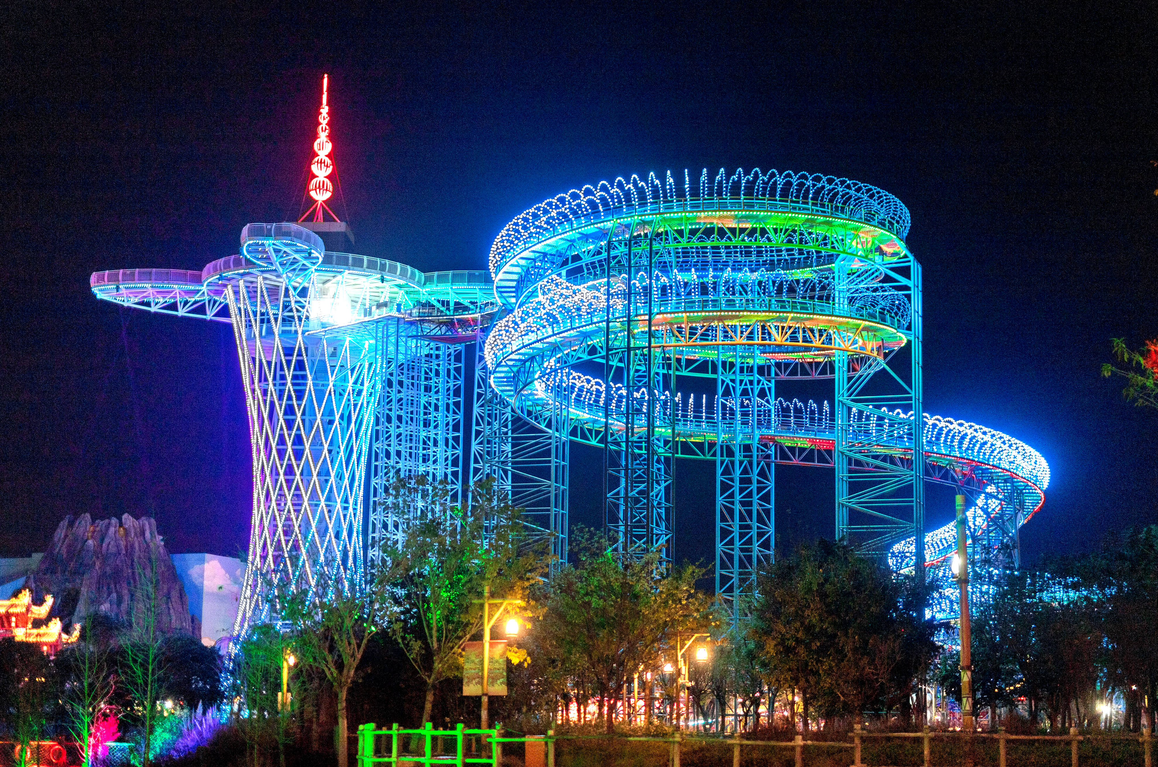 除了玩雪以外,还可以登上融创乐园广州星空塔的最高位置——观景台,可以换个角度俯瞰乐园,然后再体验九曲十八弯的高空水滑道采用360°环形造型设计,出发后宛如悬浮在高空,转弯、漂移、俯冲,玩的就是心跳,既能体验“水上过山车”的动感刺激,又能感受“空中滑翔机”的畅快淋漓。如果你勇于尝试,广州星空塔还有一个神秘项目勇敢者定制——高空蹦极可以挑战。入夜后,灯光亮起,星空塔宛如天空中的一串宝石,特别适合市民打卡。