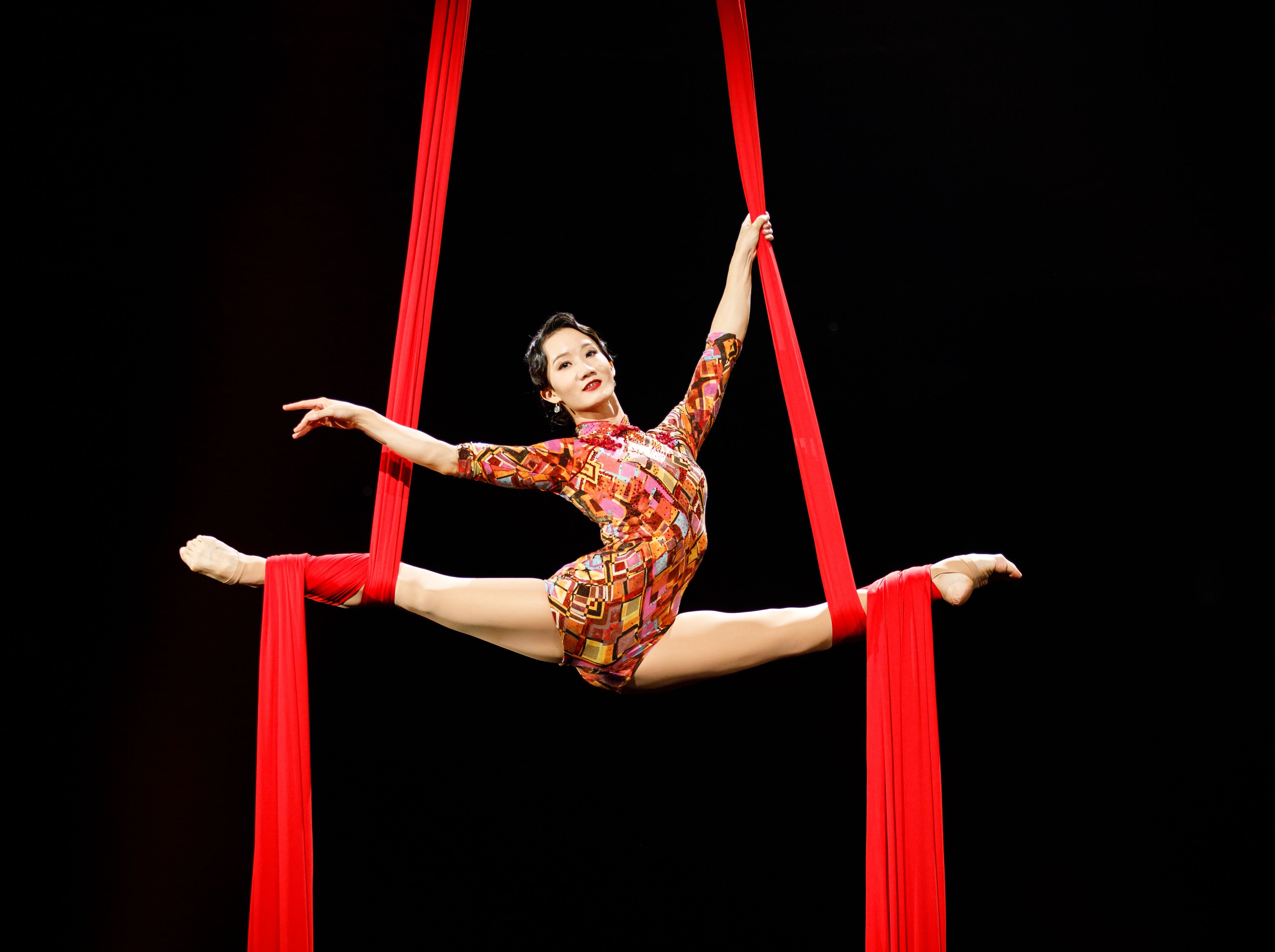 绸吊表演《韵》中,年仅26岁的庞逍如红玫瑰一般妩媚动人,每一个眼神都是满满的戏,每一个动作都做到极致,连向来精益求精的吴正丹、魏葆华都点赞其把细节处理得很到位,展现了东方杂技之美。