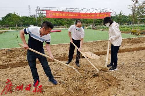 3月3日上午,钟落潭镇龙岗村果度家庭农场内一片忙碌。在一片已经平整好的田地上,白云区农业农村局的工作人员、农场工人一起抡着锄头挖坑、下苗、培土。“别种这么深,柿子树怕积水,别沤着了”,广东省农业厅农业技术推广中心陈双波老师在一旁指点着。