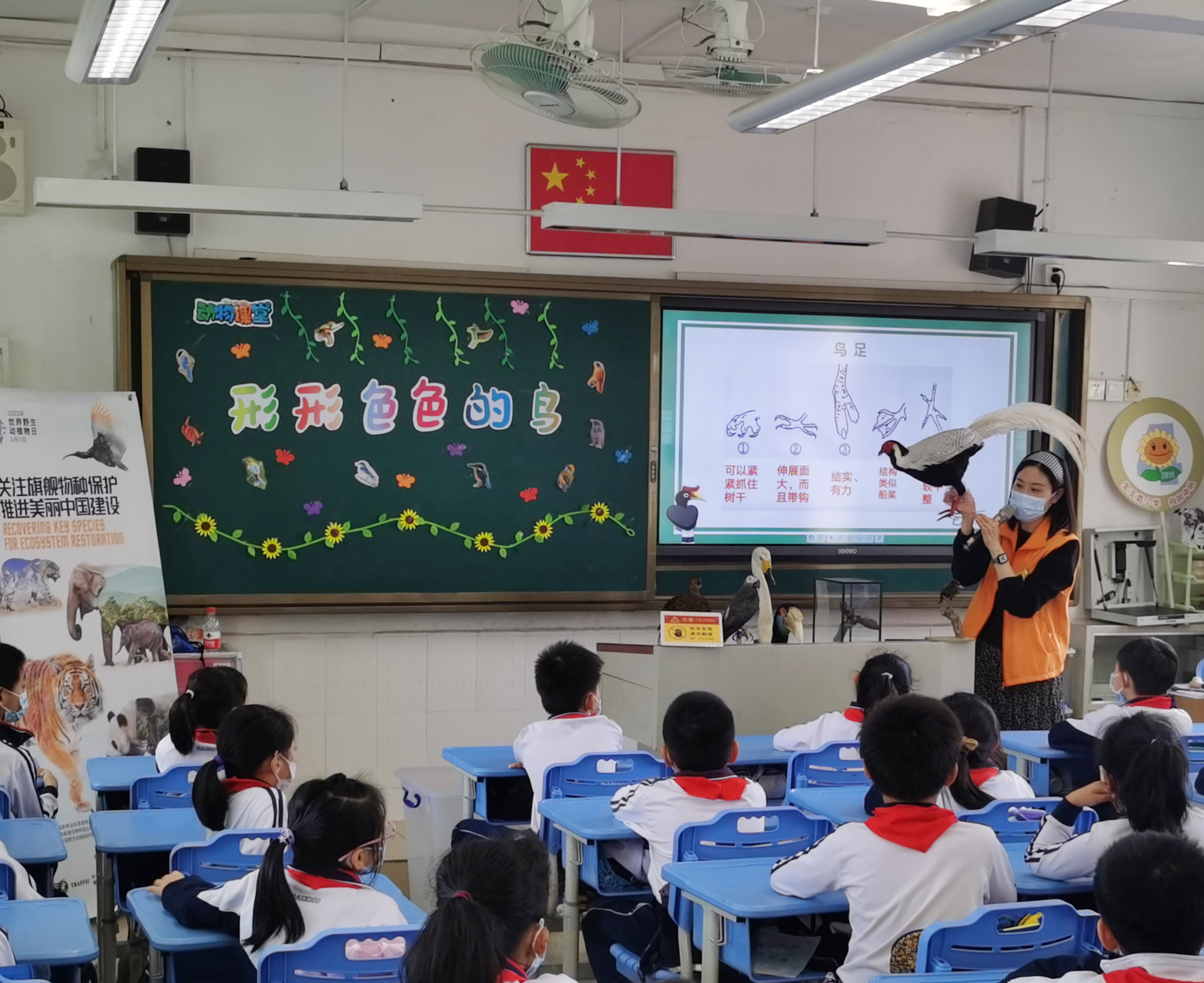 3月3日是第九个“世界野生动植物日”,海珠区宝玉直小学三年4班的同学们迎来了广州动物园的专业老师,“水獭老师”“狮子老师”送来了一节有趣生动的“动物课堂”, 带领同学们认识形形色色的鸟。