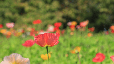 虞美人花朵在风中四处摇摆,