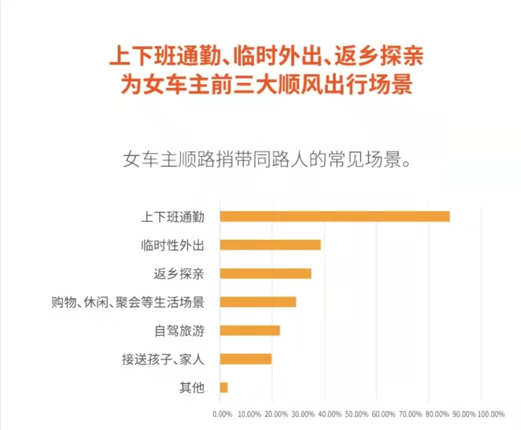 从调研看,上下班通勤是女性车主最高频的顺风车接单场景,选择比例高达87.97%。同时,临时外出、返乡探亲、购物休闲聚会接顺风车单比例也较高。这表明,顺风车在以计划出行为主基础上,如今越来越灵活高效,即时发单即时出行日益常见。