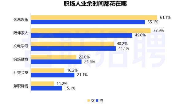为了成就更好的自己,40.2%的女性将业余时间用来学习充电,22%的女性锻炼健身,11.2%的女性兼职赚钱。虽然以上三项占比略低于男性,但是女性在陪伴家人方面做得明显更好,57.9%的女性用业余时间陪伴家人,而男性占比为49%。说明女性在自我提升的同时,也更重视照顾家庭。