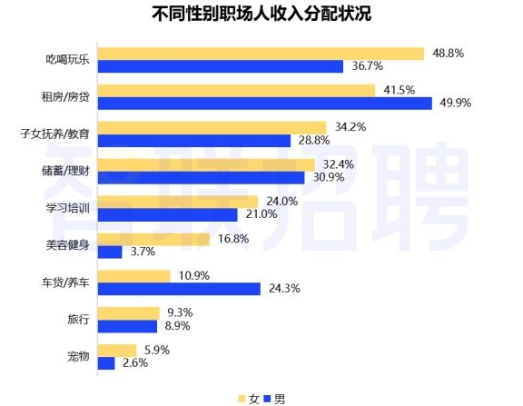 收入方面,女性能顶半边天,33.1%的女性收入占家庭总收入的40%以上。同时,女性的开支不止用于吃喝玩乐,41.5%的女性将收入主要用于租房或房贷,其次是子女抚养/教育(34.2%)、储蓄/理财(32.4%),后两者高于男性的28.8%和30.9%。