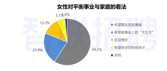 在事业和家庭的平衡方面,数据显示,59.2%的女性希望事业家庭兼顾, 21.9%的女性希望做事业上的“大女主”。更多的职场女性希望事业家庭双丰收。