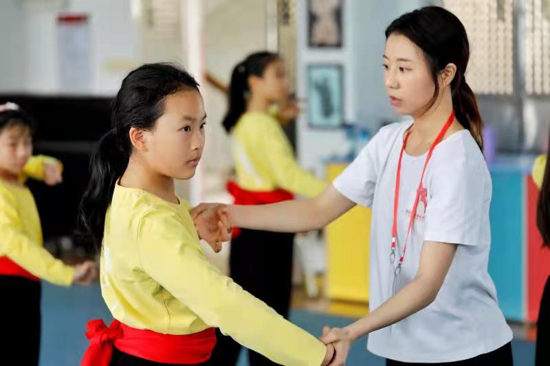 在同和社区少年宫,孩子们在粤剧室跟着老师练身段。信息时报记者 郭柯堂 通讯员 谭札烽 摄