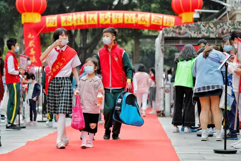 3月5日上午8时许,均禾社区少年宫所在的平沙培英学校门口一片热闹景象。家长把孩子送到校门口后,学生志愿者指引孩子们测温入校,然后按照兴趣班列队,一起庆祝均禾社区少年宫开学。