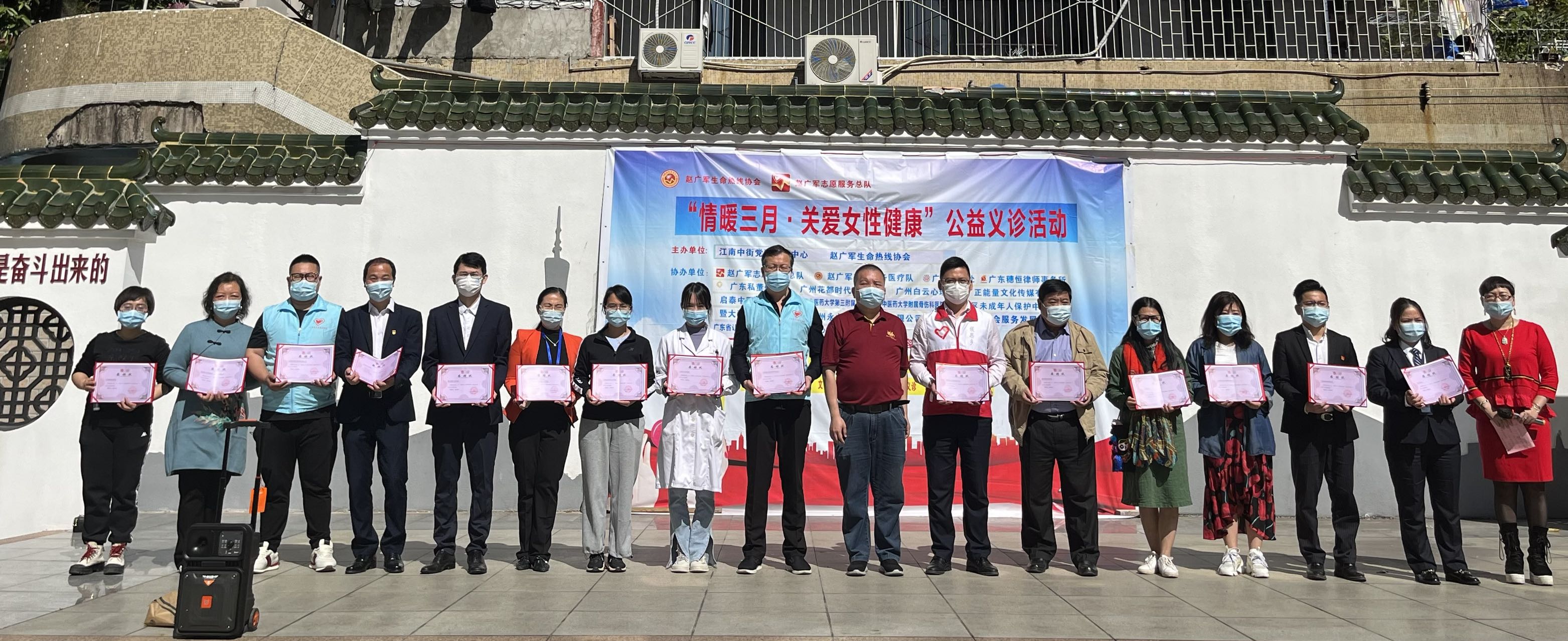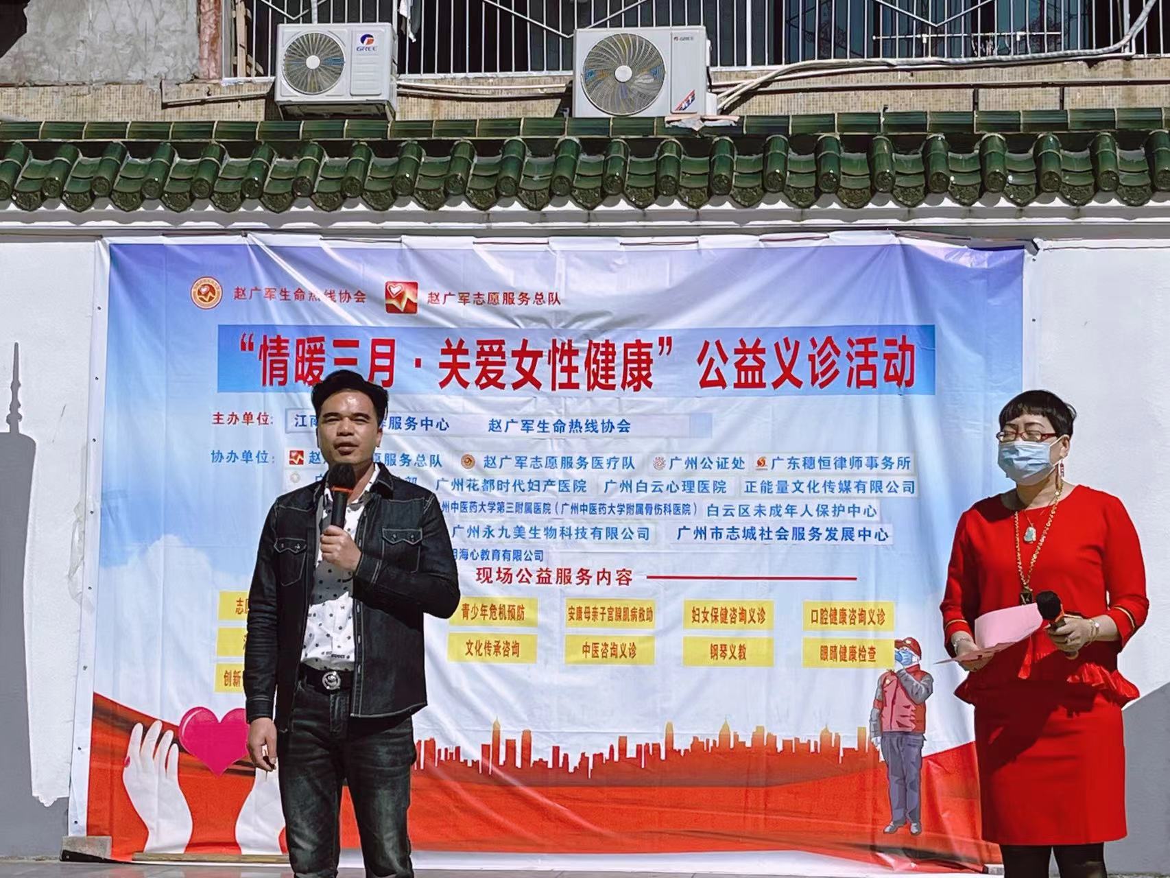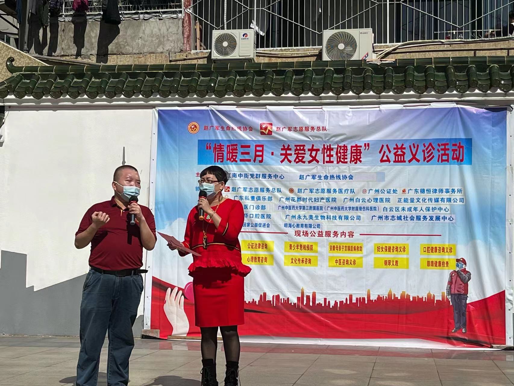 3月8日,“情暖三月,关爱女性健康”公益义诊活动,在海珠区江南中街党群服务中心举行。此次关爱女性公益活动是由广州市海珠区江南中街党群服务中心和赵广军生命热线协会联合主办,是赵广军生命热线协会“健康生活 幸福家庭”雷锋服务月公益活动的一部分。来自广州市各行各业的热心企业和资深专家为市民提供法律咨询、口腔保健义诊、中医保健、骨科理疗、公证服务咨询、玉石收藏知识咨询、声乐教育培训等方面的公益服务。全国道德模范赵广军、赵广军服务总队长陆鹏毅等人,带领众多志愿者兴致勃勃地参加了服务活动。