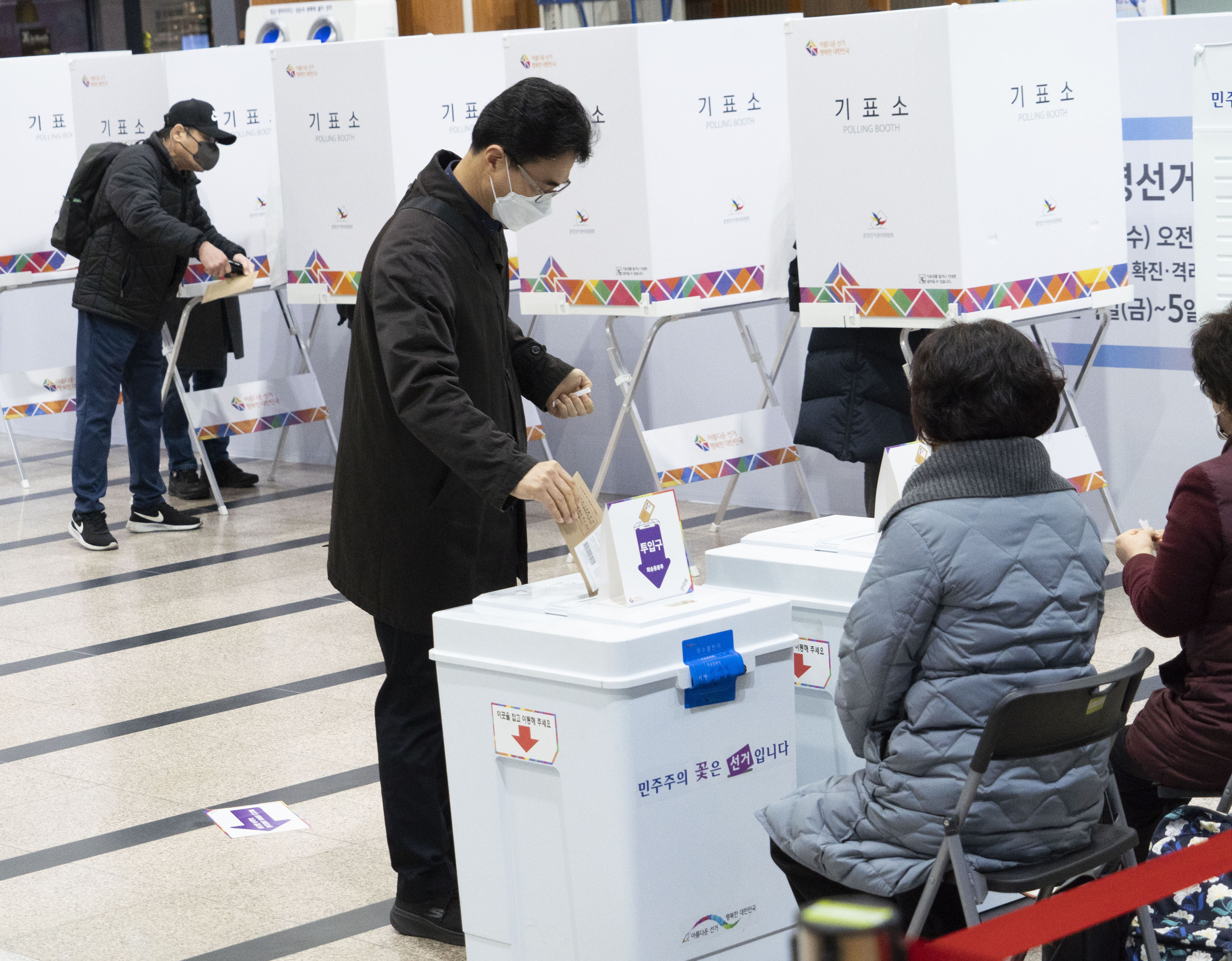 3月4日,选民在韩国首尔一个投票站投票。韩国第20届总统选举定于3月9日投票,允许选民提前投票的“事前投票”时间定在4日和5日。新华社发(李相浩摄)
