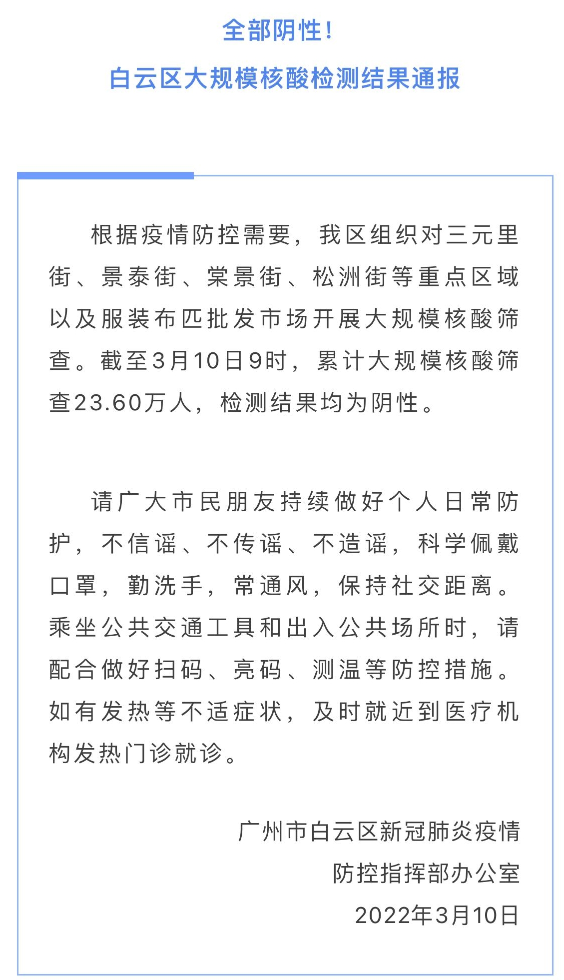 今日中午,广州市白云区新冠肺炎疫情防控指挥部办公室发布最新通报:根据疫情防控需要,该区组织对三元里街、景泰街、棠景街、松洲街等重点区域以及服装布匹批发市场开展大规模核酸筛查。截至3月10日9时,累计大规模核酸筛查23.60万人,检测结果均为阴性。