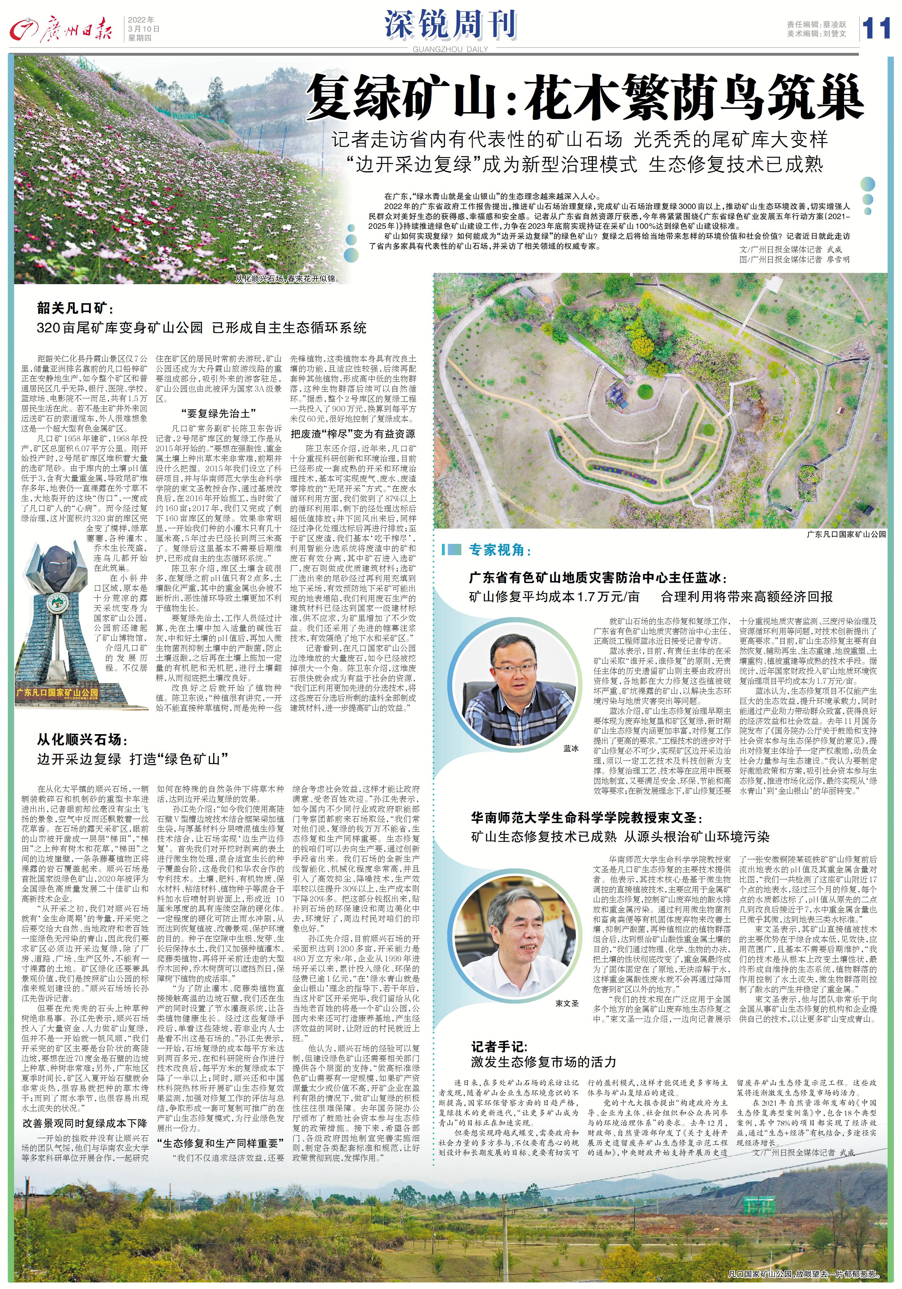 就矿山石场的生态修复和复绿工作,广东省有色矿山地质灾害防治中心主任、正高级工程师蓝冰近日接受记者专访。