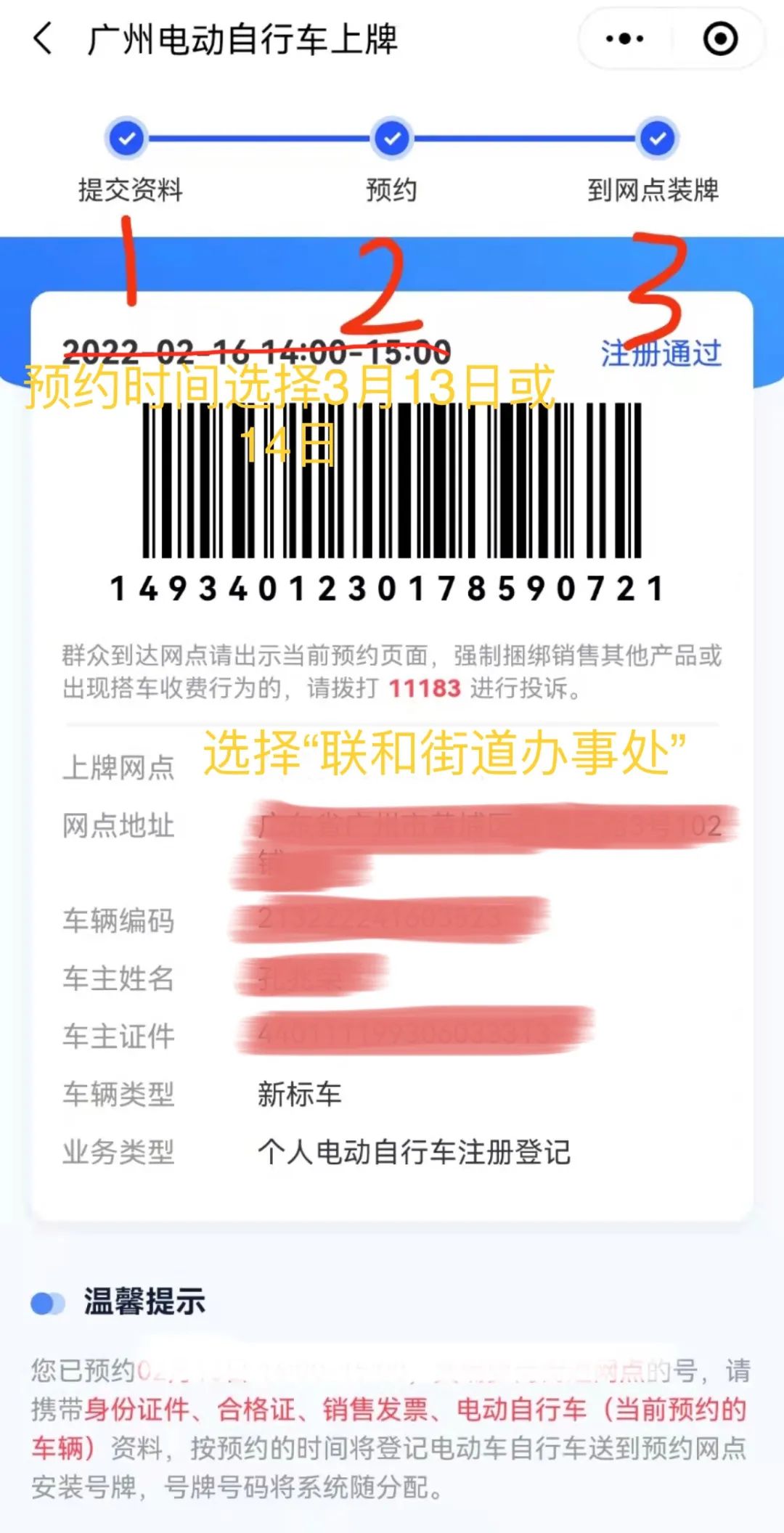 (2)预约时间选择3月13日或14日,预约地点选定“联和街道办事处”。带齐准备资料,在预约时间内到预约地点上牌。
