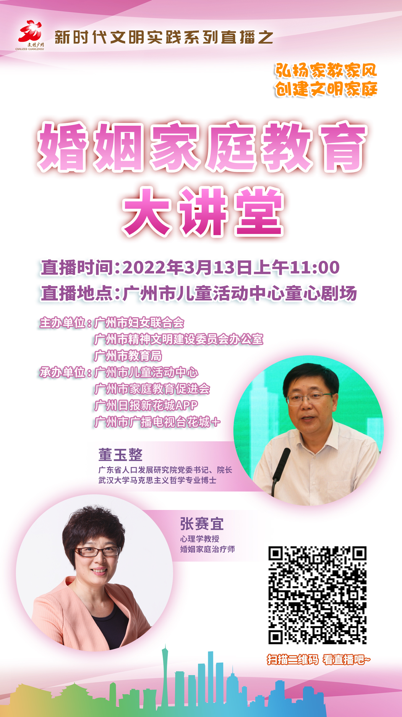 本周日(3月13日)上午11:00,由广州市妇联、市文明办、市教育局主办,市儿童活动中心、市家庭教育促进会、广州日报新花城APP、市广播电视台花城+联合承办的新时代文明实践系列直播之婚姻家庭教育大讲堂即将举办。届时,广东省人口发展研究院党委书记、院长董玉整教授,心理学教授、国家注册二级心理咨询师、婚姻家庭咨询师张赛宜教授将来到直播现场,与我们一起探讨构建幸福婚姻家庭的秘诀。