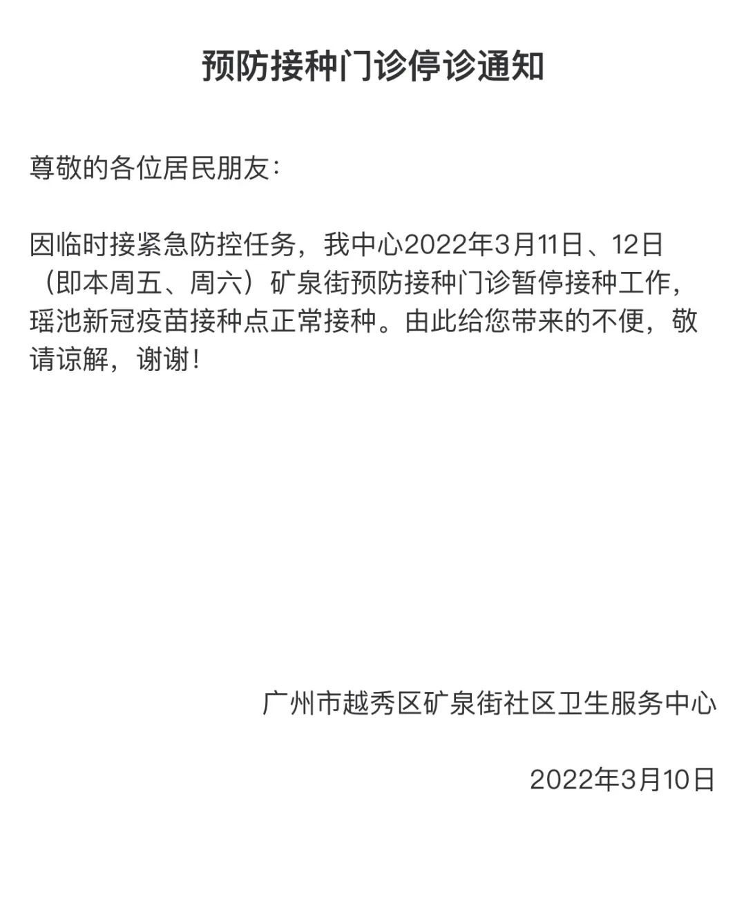 3月10日上午,越秀区矿泉街社区卫生服务中心发布了通知。通知称,因临时接紧急防控任务,矿泉街社区卫生服务中心预防接种门诊将于3月11日(周五)、3月12日(周六)停诊,暂停接种工作。但瑶池新冠疫苗接种点正常接种。由此造成的不便,敬请谅解。