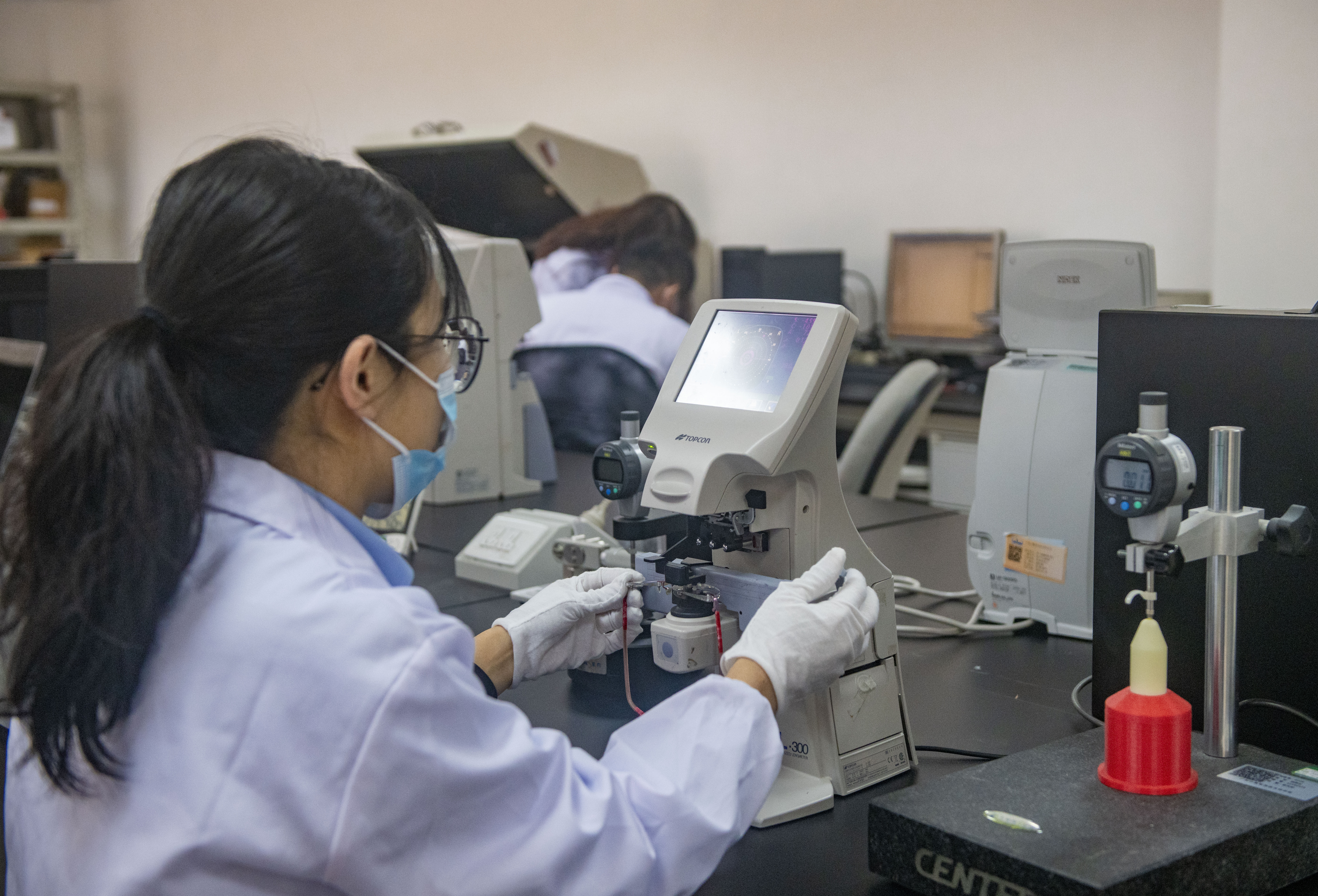 广州计量院高级工程师张洁介绍,眼镜产品检测项目多样,数量有100多个,其中定配眼镜检测的内容包括光学度数、光学中心水平距离、透光率等15个项目。