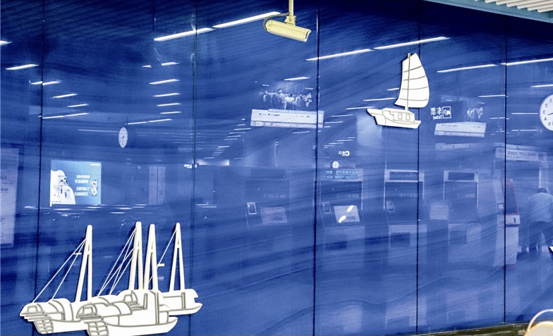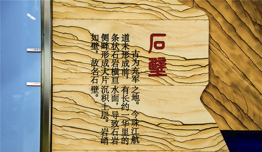 7号线的石壁站则展现的是水乡文化,站厅的文化墙上用岩峭、珠江、渔船细细为来往的路人讲述着石壁的过去和现在,讲述着石壁的鱼乡文化。