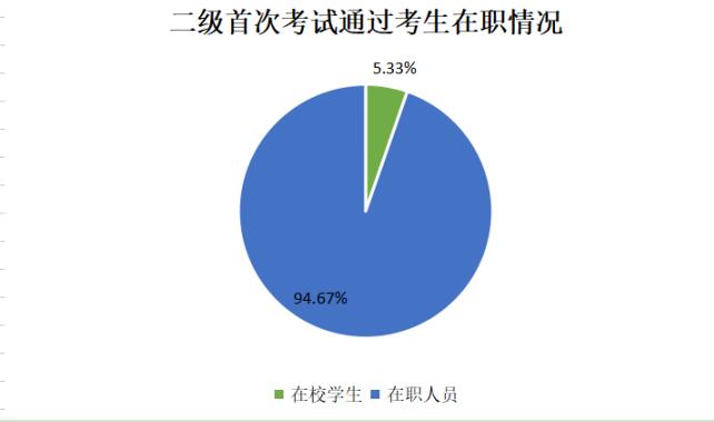 通过考试的75名考生,其中在校学生4名,在职人员71名,在职人员占比达到94.67%。二级考试侧重考查考生在金融科技领域的实践能力,绝大部分在职人员具备相关从业经验,对技术场景应用、方案规划设计等有着较强的理解和应用能力,在二级考试上具有较大的优势。