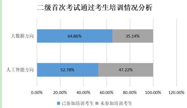 通过考试的75名考生中,共有43名考生参加二级项目培训。其中,人工智能方向培训考生19人,占比为52.78%;大数据方向培训考生24人,占比64.86%。两个方向参加培训的考生通过比例均高于该方向下的通过率。