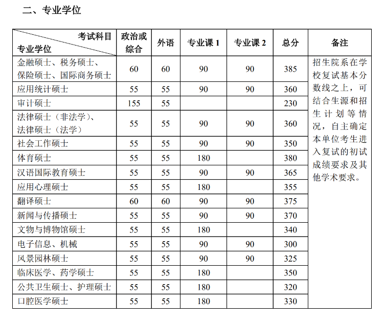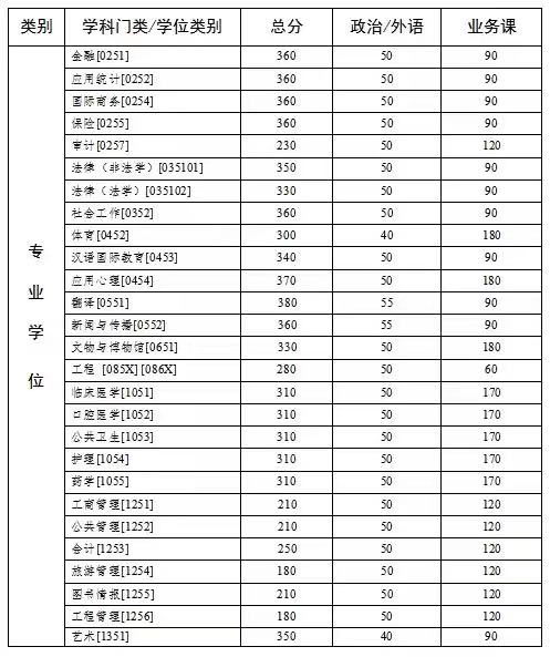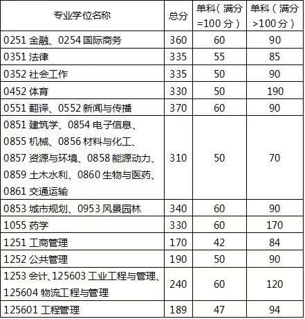 专业学位方面变化较大,有20个专业上涨:工程中的交通运输上涨80分,工程其他专业、新闻与传播、图书情报上涨30分,社会工作、汉语国际教育、工程管理上涨20分,国际商务、体育、艺术上涨15分,金融,应用统计、保险、法律(法学)、应用心理、文物与博物馆、临床医学、口腔医学、护理、药学上涨10分。