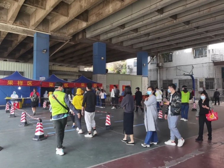 在天河区沙东街有利服装北城西边广场核酸检测点,8名青年志愿者根据培训指引的要求,经过健康查验、岗前培训,并做好自身防护后,立即投入到紧张有序的核酸检测工作中。