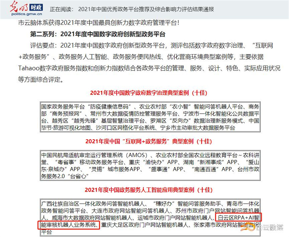 白云区RPA+AI智能审核机器人业务系统被评为2021年度中国政务服务人工智能应用十佳典型案例之一。