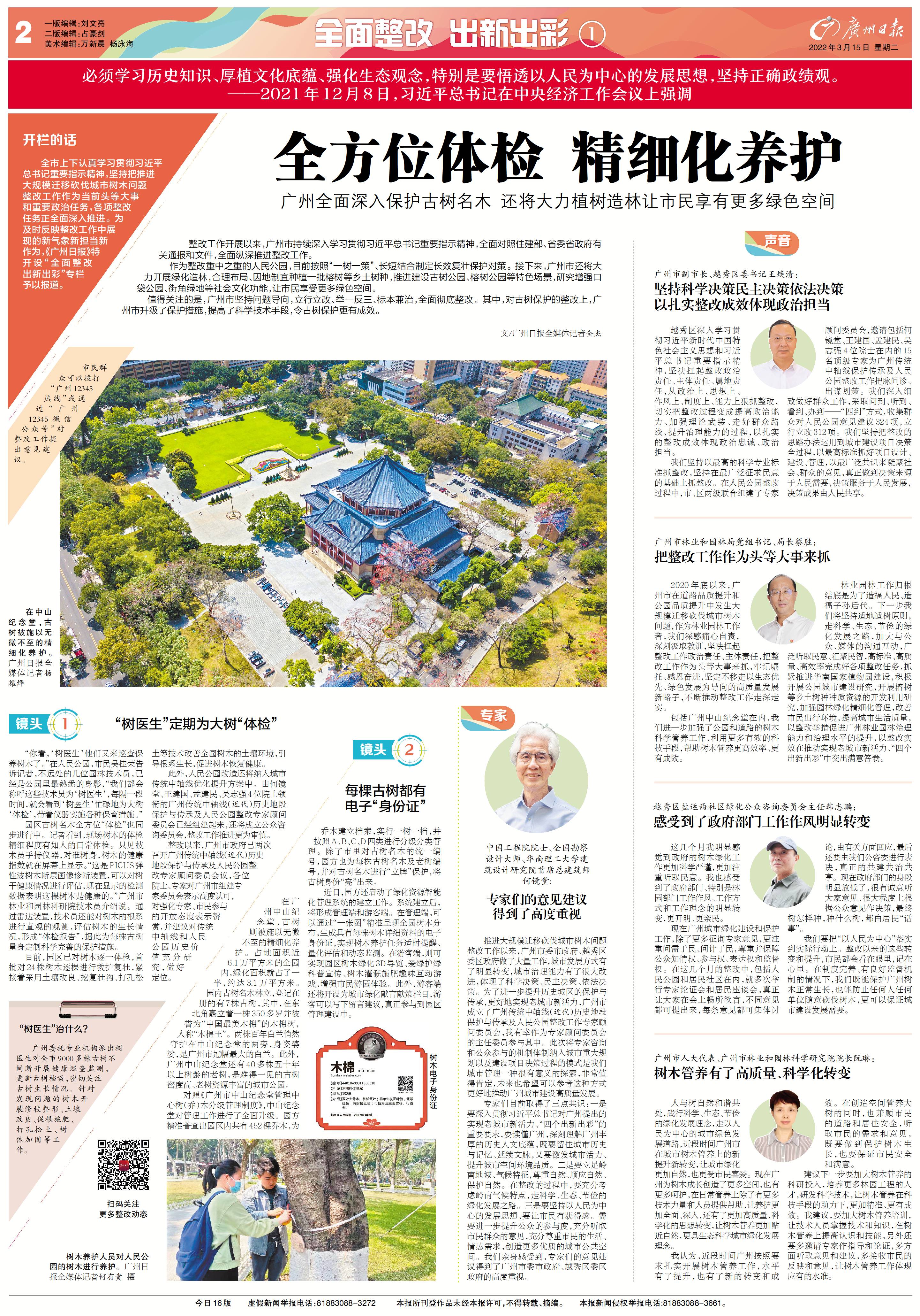现在广州城市绿化建设和保护工作,除了更多征询专家意见,更注重问需于民、问计于民,尊重并保障公众知情权、参与权、表达权和监督权。在这几个月的整改中,包括人民公园和居民社区在内,就多次举行专家论证会和居民座谈会,真正让大家在会上畅所欲言,不同意见都可提出来,每条意见都可集体讨论,由有关方面回应,最后还要由我们公咨委进行表决,真正的共建共治共享。现在政府部门的身段明显放低了,很有诚意听大家意见,很大程度上根据公众意见作决策,最终树怎样种,种什么树,都由居民“话事”。