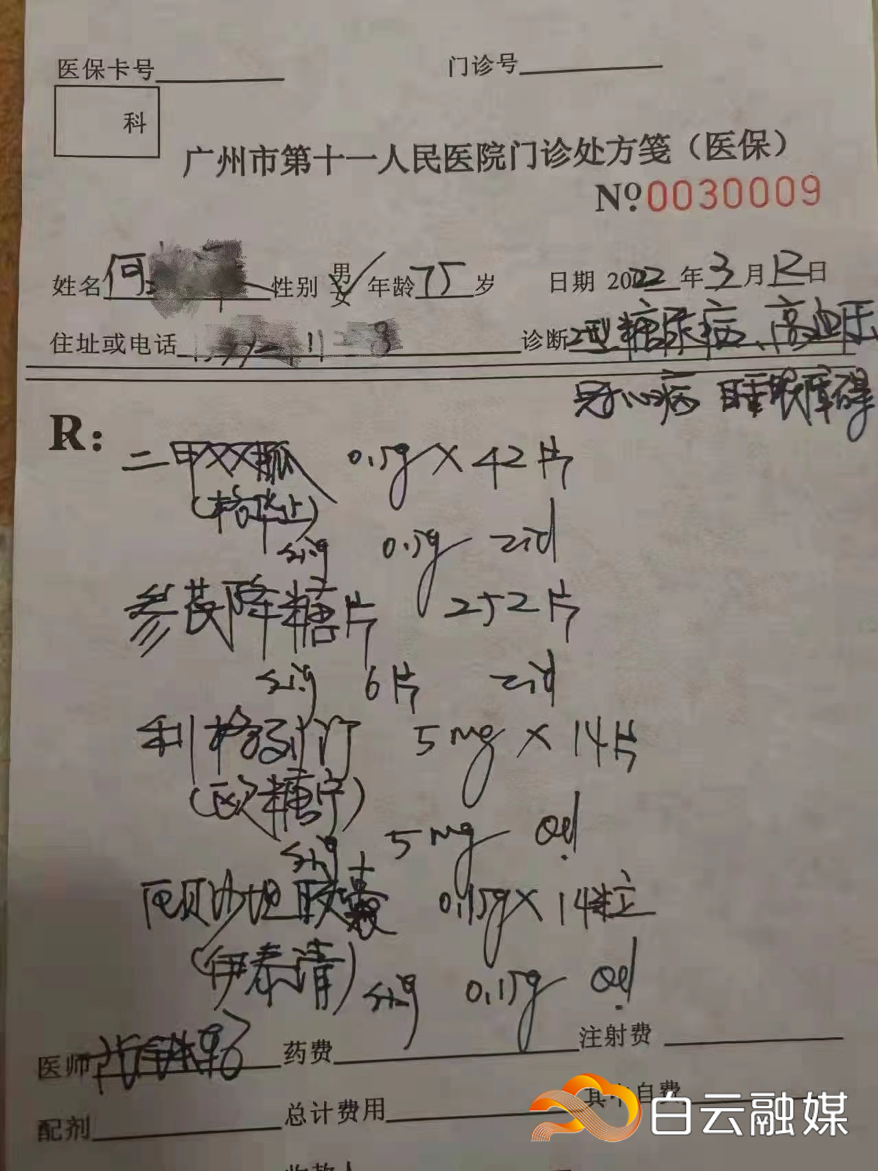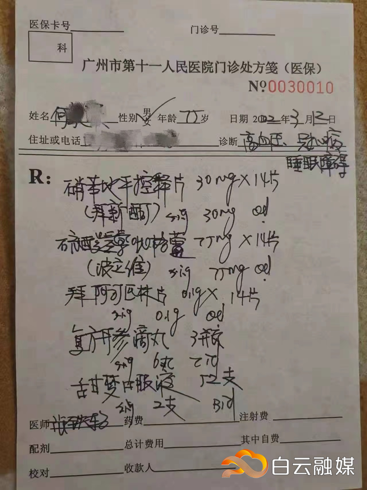“何伯的药很难买,我们奔走了周边好多家药店,都被告知是处方药,需医生开处方单,所以我又安排了医生给何伯在线问诊、开药。”颜瑞涧说,何伯不懂操作智能手机,她又帮其进行网上挂号、联系医生,开出处方后,再次奔走了3家药店后,终于为何伯买齐处方笺上的9种药物。