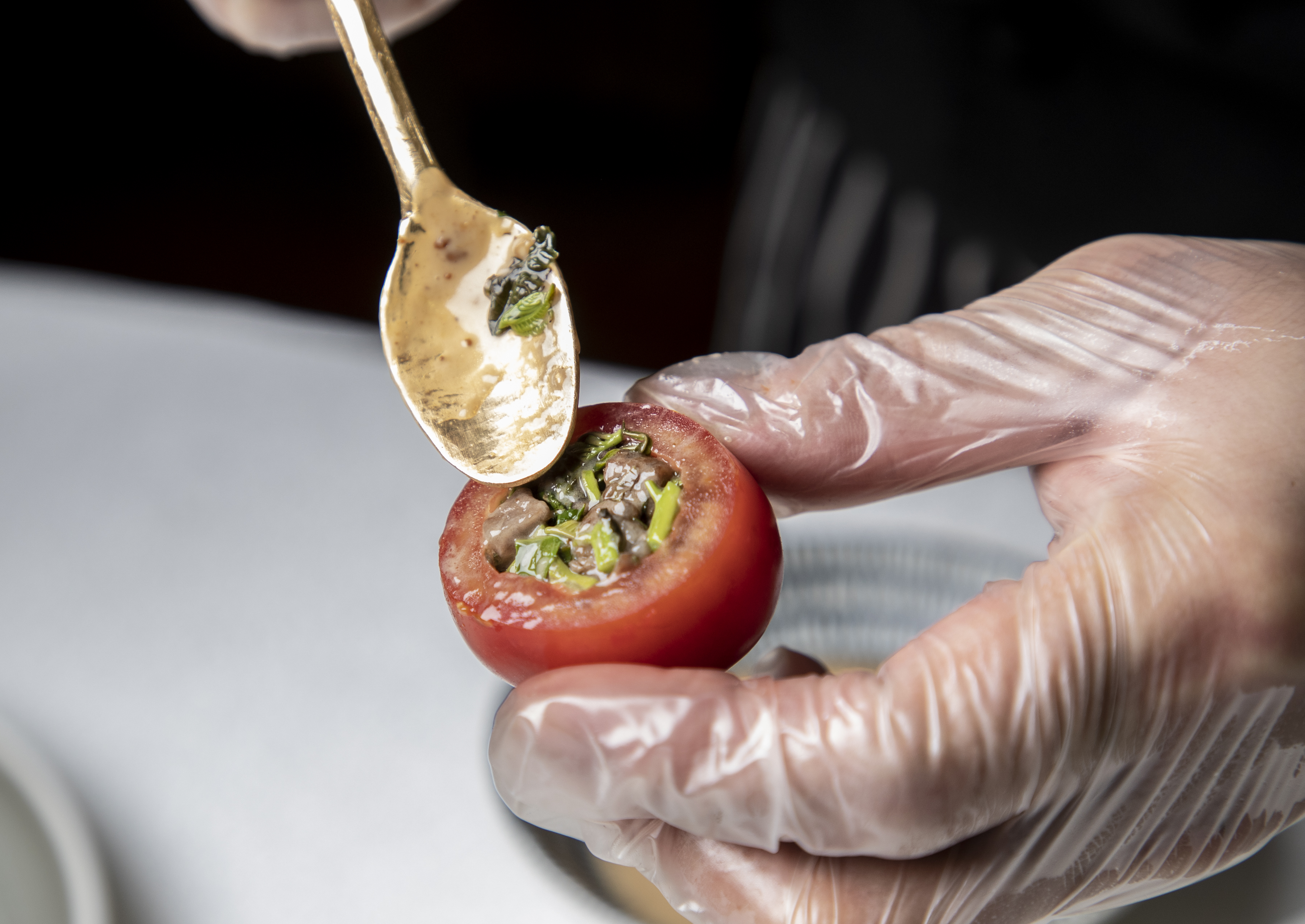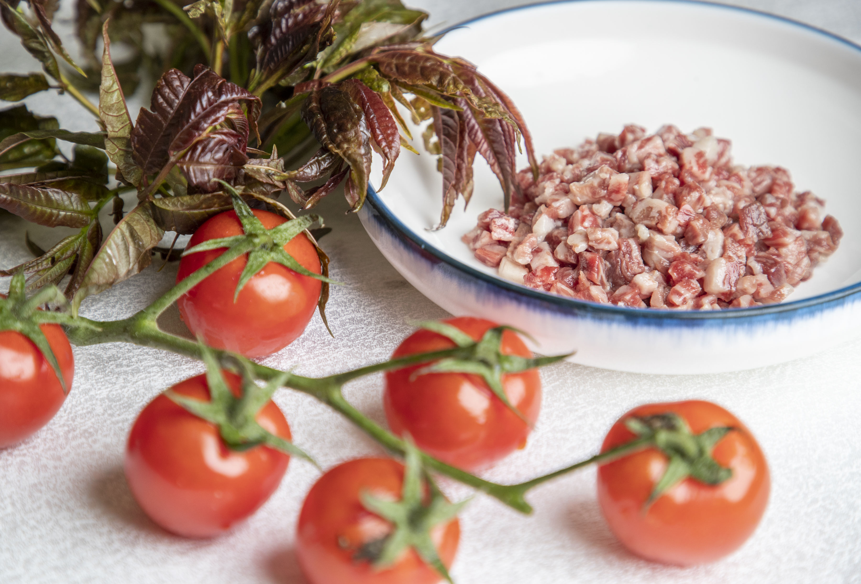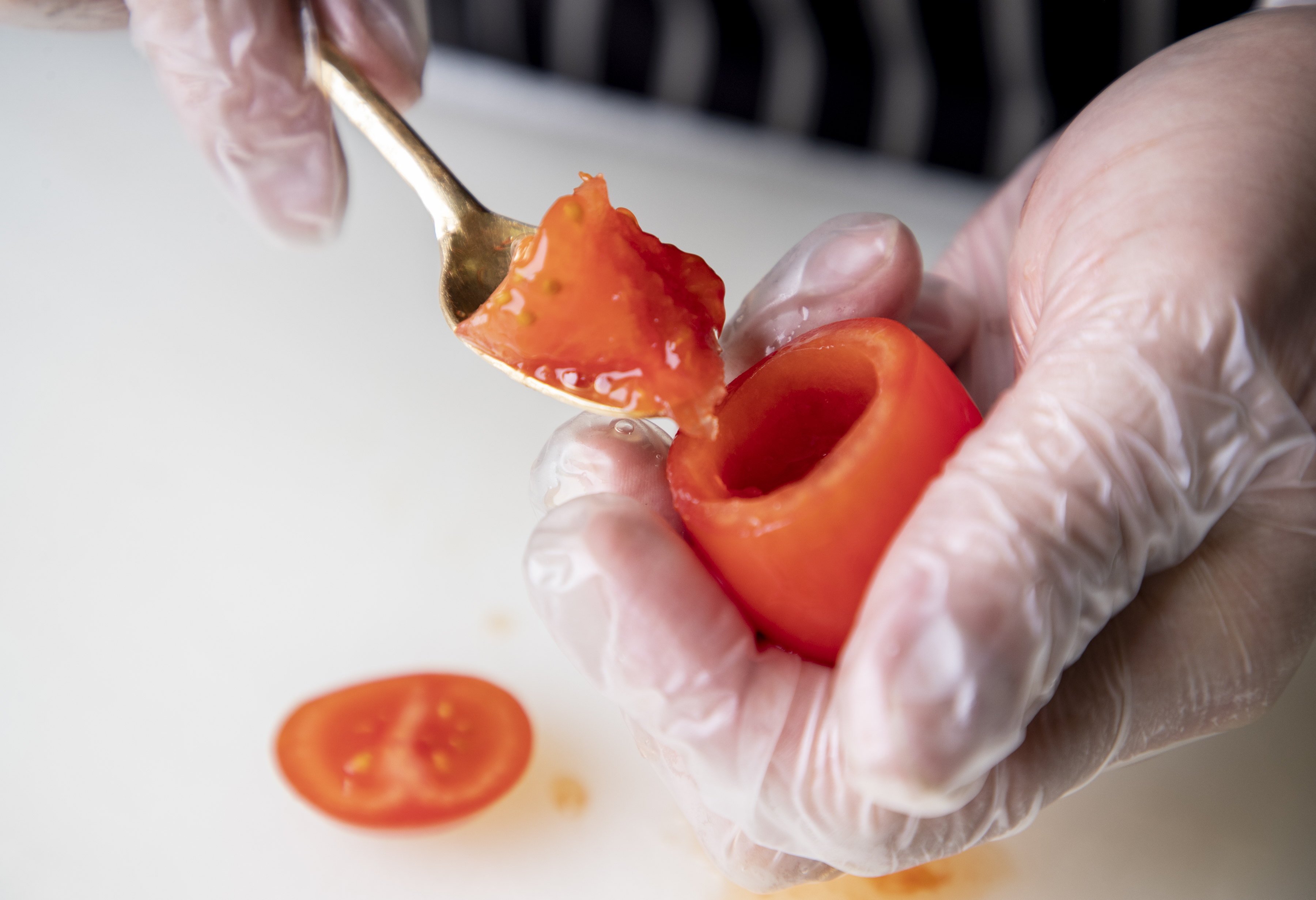1、先对食材进行预处理。牛肉切成粒状,香椿焯过后切碎,番茄挑选中等大小的,介乎大番茄与小番茄之间。将番茄的底部1/5处切去,用小勺子将番茄肉挖出,小心处理以防压迫到番茄导致变形。