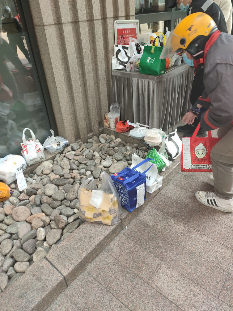 一栋靠近建外SOHO的写字楼,在每个出口处都设置了暂存外卖的桌子。但中午外卖的量实在是太大,桌子上搁不下,只能放在地上。外卖骑手给订餐者打电话,然后拍张外卖的照片,就转身奔向下一个目的地。