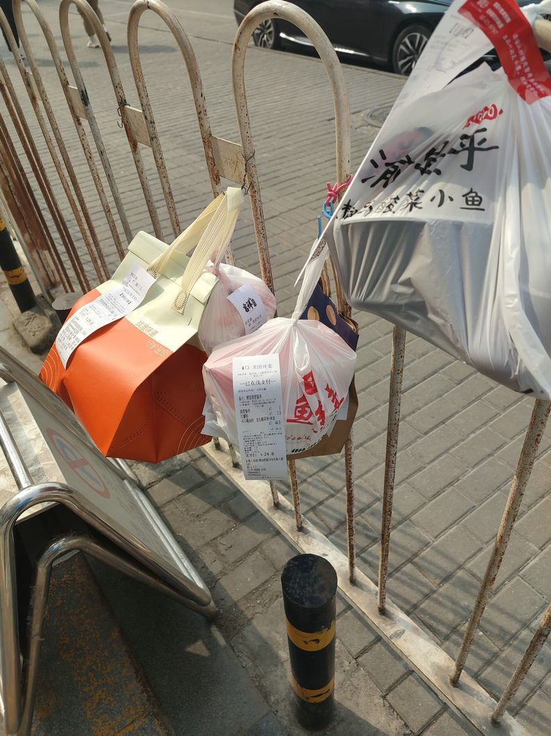 酒仙桥地区也是写字楼比较集中的区域。同样是中午饭点,外卖骑手和订餐者的“接头”时间。和高楼林立的CBD略有不同,这里有很多企业园区。有些园区面积很大,外卖骑手似乎有些着急,他们有时候给订餐者打完电话,把外卖往园区栅栏上一挂就转身离开了。这些挂在栅栏上的外卖,有些也没有封签。