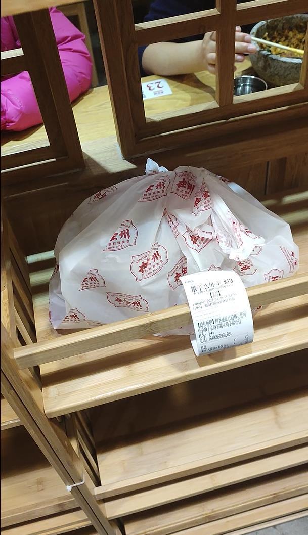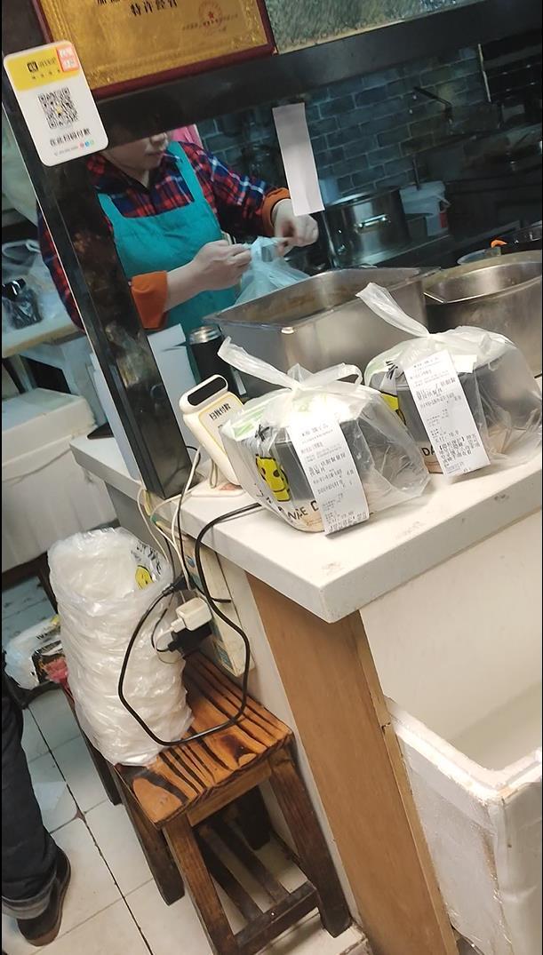 记者看到,这里一处档口的服务员正在紧张地装饭、盛菜,她需要快速应对端着空盘等待着的顾客。同时,她还要麻利地打包,对付从外卖平台上不断降临的订单。只见她把几个餐盒装满,然后把餐盒放进塑料袋,简单地在塑料袋上打了两个结,没用封签,就放在餐台上,等外卖骑手取餐。记者在这里的另一处档口,点了一份火烧外卖自提。服务员把火烧放进小纸袋,然后用塑料袋装好,同样打了两个结。记者问这个服务员,为什么没把塑料袋密封。她回答:“哦,是怕外卖员拿走里面的东西吗?老板没有跟我们说过要密封,我们跟老板反映一下这个事。”