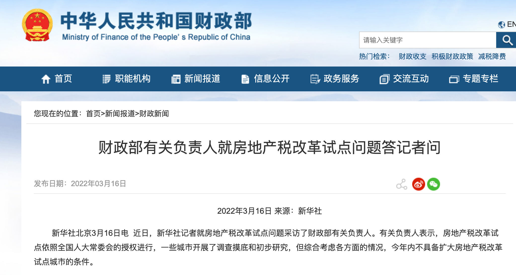 3月16日,财政部官网发布财政部有关负责人就房地产税改革试点问题答记者问的内容。该内容称, 近日,新华社记者就房地产税改革试点问题采访了财政部有关负责人。有关负责人表示,房地产税改革试点依照全国人大常委会的授权进行,一些城市开展了调查摸底和初步研究,但综合考虑各方面的情况,今年内不具备扩大房地产税改革试点城市的条件。