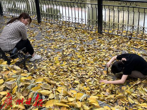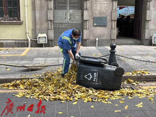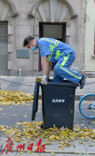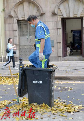 最近几天,大树落叶增多,成为广州街头一景,环卫工人每天要出动三到四次才能清理完毕。广州荔湾沙面,环卫工人将大树下的落叶扫成一堆后,倒进垃圾桶里,由于树叶比较松散,为了节省空间,环卫工人爬进桶里将树叶压实,装满一桶落叶需要重复三次这种土办法。