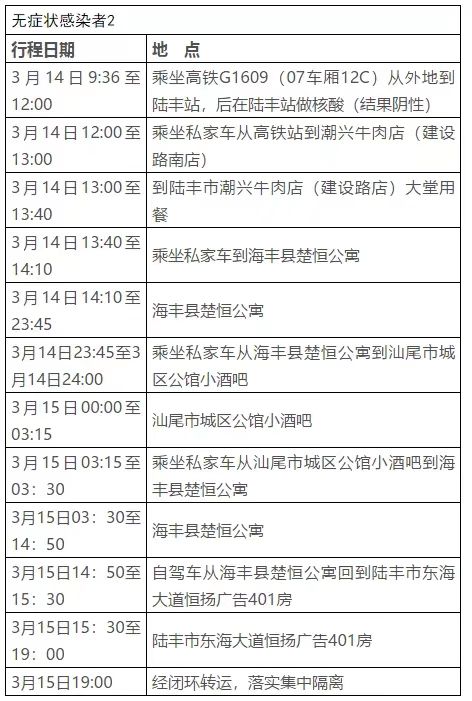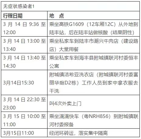 3月16日,汕尾市海丰县、陆丰市分别报告1例新冠肺炎无症状感染者,在密切接触者集中隔离期间核酸检测初筛阳性,后送汕尾市疾控中心复核阳性,综合流行病学调查、临床表现、实验室检测等,经专家组会诊,诊断为新冠肺炎无症状感染者。目前已转运至定点医院隔离治疗,情况稳定。汕尾市第一时间启动应急处置机制,立即开展流行病学调查、相关人员排查、采样检测、重点场所管控及环境消毒等防控工作。现将行动轨迹公布如下: